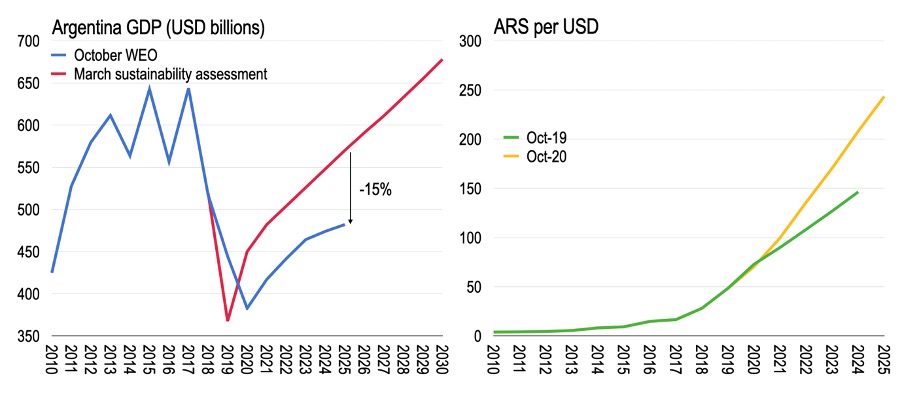 Second, what’s new? Well, the Fund has changed tack substantially since the March “technical assistance” sustainability document when the path of nominal GDP in dollar terms was expected to make a heady recovery. Indeed, then the USD value of GDP was expected to return quickly to levels achieved at after the recent overvaluation. But GDP in USD terms by 2025 is now about 15% below the level expected then, USD482BN being much closer to the authorities’ projection during the debt negotiation of USD488BN. Or, previous dollar GDP ebullience has given way to something more measured after undermining the authorities’ negotiating position.