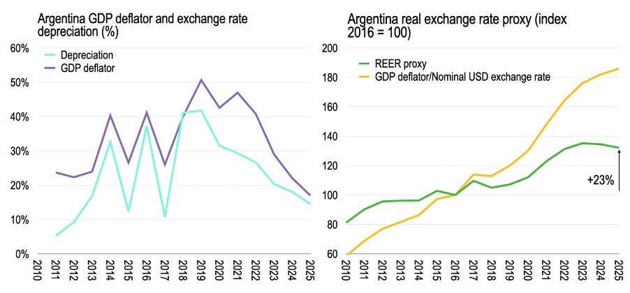 Third, and more worrying, what stinks? Well, wouldn’t the above nominal exchange rate path be associated with substantial inflation. Indeed. The chart below shows the rate of depreciation (year average) against the percent change in the GDP deflator. And what we see is a large gap opening up in terms of the rate of growth of the GDP deflator in coming years—which is normally only slightly above the and the rate of depreciation of the exchange rate. Now, I have no idea what the inflation rate of Argentina’s trading partners is for the purposes is calculating the real exchange rate. But below we assume the real exchange rate is a geometric weighted average of the GDP deflator in Brazil and 4% inflation rate for other trading partners with a weight of 50% each. As a rule of thumb, this is probably not too far off. I hope.