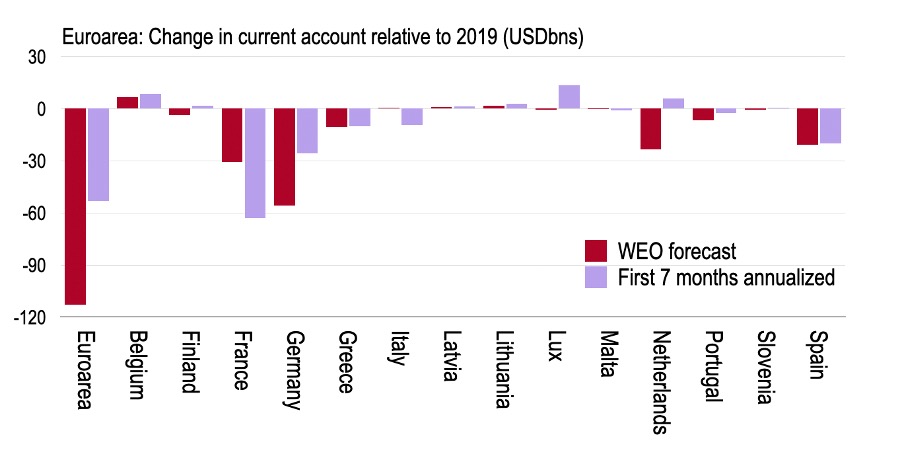 Consider next the current account projections of individual euroarea economies shown above. The latest monthly data from Eurostat and the ECB is through July, which became available in September, and provides a snapshot of the change in current accounts for most of the euroarea countries as well as in the aggregate. Crudely annualizing the change in these monthly readings, converted to USD, on the same period in 2019 and comparing with the IMF’s full year change provides a sense of the forecasts in the WEO. The full year change in the euroarea surplus in the WEO is USD113BN compared with a USD53BN naïve annualized change in the data. Within countries, Italy’s current account balance is expected to improve marginally by the IMF, despite the tourism hit, whereas it her surplus has fallen somewhat. The French deficit has weakened most and is set to be double the WEO forecast when annualised. The German surplus in the WEO is expected to suffer the most, but in reality, will be less than half this. Only Belgium, Greece and Spain are ballpark reasonable compared to the real world. As above, while there are some seasonality issues that might not be fully accounted for by extrapolating on non-seasonally adjusted data, the errors are unlikely to be as large as those built into the WEO.