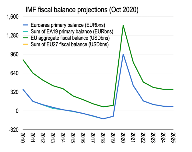 How can we judge how this package has been reflected in the IMF’s analysis? One way is by comparing the aggregate euroarea budget balance with the sum of individual countries, as above. In fact, it’s a bit more complicated since the RRF is an EU innovation, and sits on the balance sheet of the EU in Brussels and counts as non-resident transfers to the euroarea as a whole. Anyway, just to check either way the above chart tracks the EU and euroarea aggregate budgets compared to the sum of individual countries. (The EU27 here being with Croatia and without the UK.) But it’s rather a stale exercise. To a very small margin—such that it can hardly be seen—the aggregate fiscal balance is simply the sum of individual country fiscal balances. What should show up is EUR390BN larger EU fiscal position than the sum of individual countries as Brussels raises these funds to transfer to individual countries cannot be found. In other words, there has been no effort to fold this policy innovation into the fiscal forecasts. This is despite the fact that the statistical annex claims it has been included in the data for Spain—and should therefore be included for all countries for consistency and to allow some cross-country analytical comparisons.