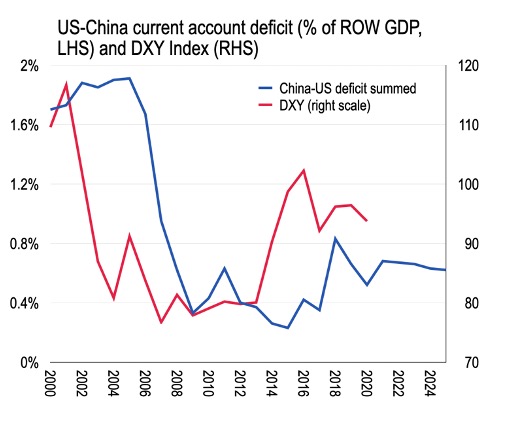 Why does this matter? Well, the US-China current account nexus is increasingly important for the global supply of dollars, which in turn helps determine the dollar exchange rate. For example, in recent years China’s bilateral position has taken an ever-larger share in the US current account flows, meaning they absorb and then recycle dollars to the rest of the world. Summing the US-China current account relative to rest of the world GDP gives a proxy sense of the availability of dollars through current account, therefore, as in the chart above. Periods where the combined current accounts are in large deficit, such as in the 2000s, meant dollars were plentiful following the strong USD in the early 2000s. But with such an ample supply, the dollar index (DXY) fell associated with a fall in the overall deficit here. By 2014 the dollar was in short supply to the rest of the world, therefore, at a time where the monetary cycles globally called for a relative tightening of US policy. The stars were aligned for a period of dollar strength which might precede a widening of the combined deficit once more—but the results haven’t been huge.