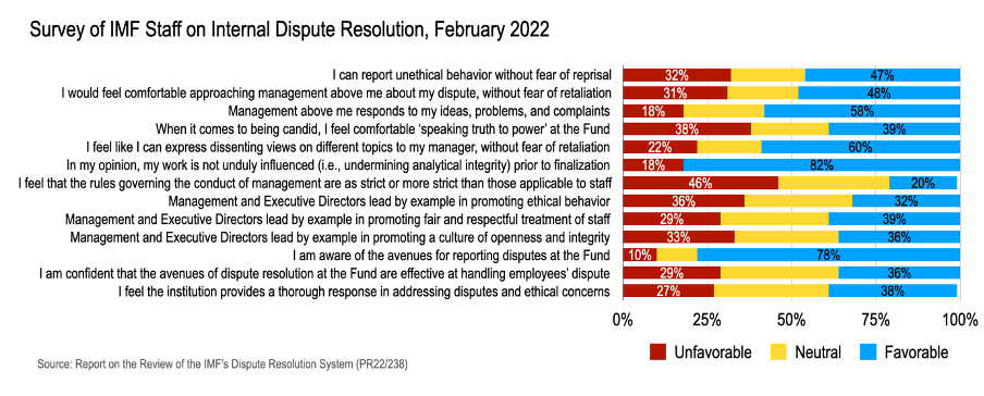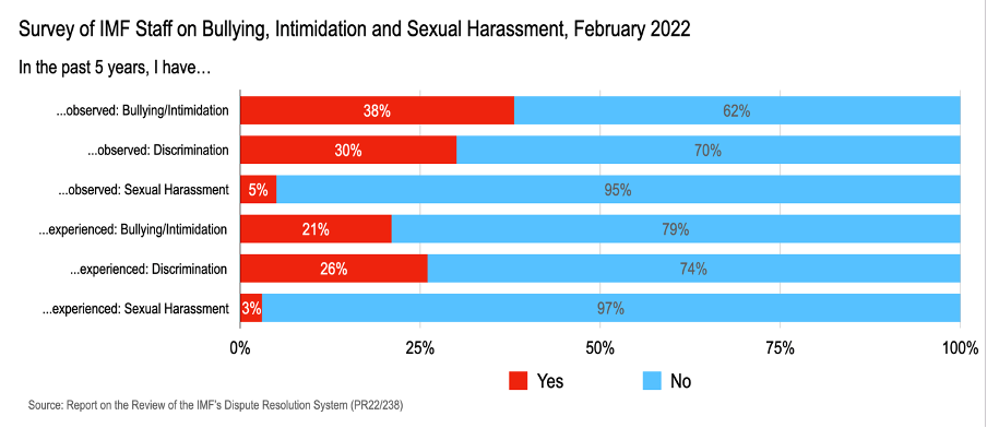 The Weidmann Panel began with a survey to get a sense of: (i) “staff’s perception of the Fund’s dispute resolution system from the perspective of those for whom the system was created;” as well as (ii) the bullying, intimidation and sexual harassment witnessed or experienced by staff over the past 5 years.